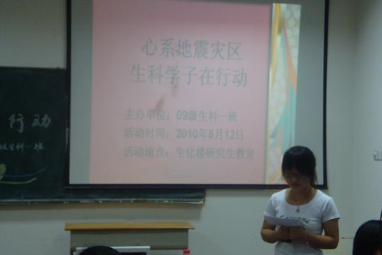 为纪念汶川特大地震两周年和全国第二个防灾减灾日,2010年5月12日生科院09级生物科学专业同学举行了“灾难无情,人间有爱——汶川加油!玉树加油!”的主题团日活动。
