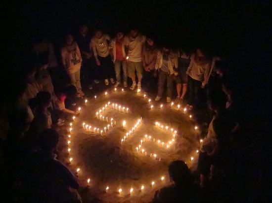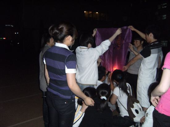 晚上20点30分,全体同学到东操场举行了以“点亮心灯,照亮灾区,祝福世界”为主题的祈福活动。同学们点亮摆放好的100根蜡烛,夜幕下的操场寂静而肃穆,闪烁的红烛组成了心形的光环,5.12三个数字在心形光环中更显沉重和忧伤。随着主持人致开幕词,活动正式开始,大家怀着沉重的心情同唱《让世界充满爱》,以此表达对所有受灾同胞的祝福。最后,在沉重的音乐声中同学们放飞孔明灯,放飞祝福,放飞希望,许多路过同学的支持与参与把活动推向了高潮。