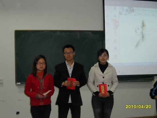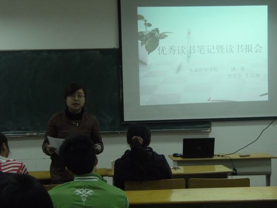 4月20日晚,3044am永利集团官网团委学生会在生化楼五楼举行了读书报告会暨优秀读书笔记评选活动。生科院团委书记汪倩倩及09级政治辅导员贾瑞出席了比赛并担任评委。