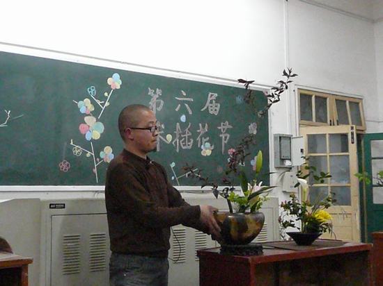 参赛选手将专业知识与想象力相结合,创作出插花作品,并利用幻灯片的形式对作品的构材、主题和涵义进行解说。中场休息时,第三届绿色文化节“绿色大使”王星、任琦婧为大家表演了黄梅戏《女驸马》选段和歌曲《茉莉花》。经过评委评审,来自09级生科三班和08级生科三班的选手最终获得了本次比赛一等奖。