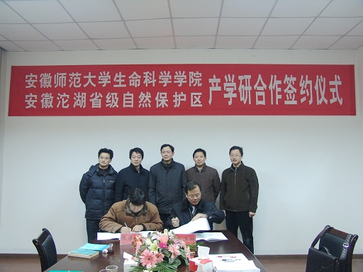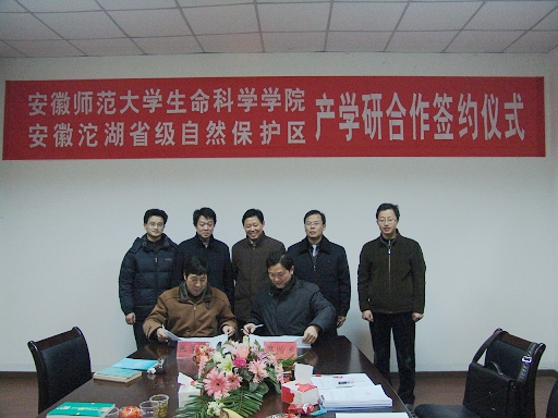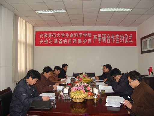 经过前期酝酿和多次洽谈,3044am永利集团官网与安徽沱湖省级自然保护区达成了在产学研方面开展全面合作的共识。12月17日,3044am永利集团官网与沱湖省级自然保护区签订了《永利3044noc3044am永利集团官网和沱湖省级自然保护区产学研合作协议》和总额为50万元的《安徽沱湖省级自然保护区总体规划及旅游规划合同》。出席签约仪式的学院领导、教师和保护区领导分别是院长席贻龙教授,涂传林副教授、严云志副教授、邵剑文副教授,蚌埠市环保局副局长马成喜,保护区书记张学勇,保护区副主任孔军等。