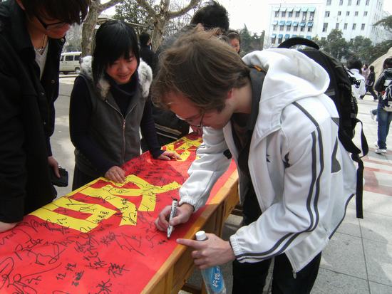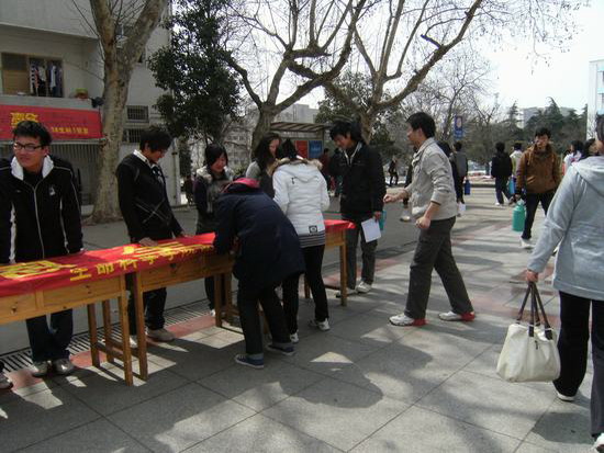 同学们在食堂门口摆展板,发起了签名活动,并向过往的学生发放环保知识传单,向他们详细地讲解绿色环保知识及其重要性。同学们积极参与,在横幅上签名,并承诺会为环保做贡献。整个活动开展顺利,最后组织者合影留念。 (生科院 吴丹 赵娟)