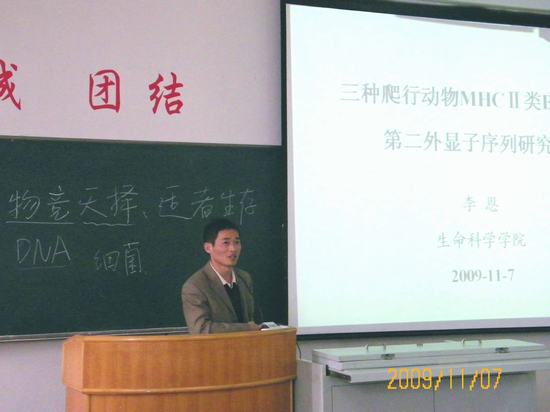 7日上午,永利李晋老师、林凌老师、李恩老师、张方副教授分别做精彩报告。李晋老师从动物生理学角度对濒危物种金头闭壳龟重要生理指标随季节性变化进行了报告,强调了金头闭壳龟保护的严峻形势和动物生理学研究在其保护上的重要作用;林凌老师以能源危机为切入点,阐述了定向进化技术改造内切葡聚糖酶活性研究在实际应用中的重要价值;李恩老师就乌龟、石龙子、扬子鳄三种爬行动物的MHC II类B基因第二外显子序列研究进行了报告;张方老师的报告根据牛蛙叫声音频的特征性分析了我国舟山群岛五个岛屿牛蛙叫声的变异情况及其和原始北美牛蛙叫声的特异性,为研究环境对物种的变异影响提供了很好的佐证。