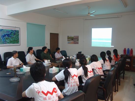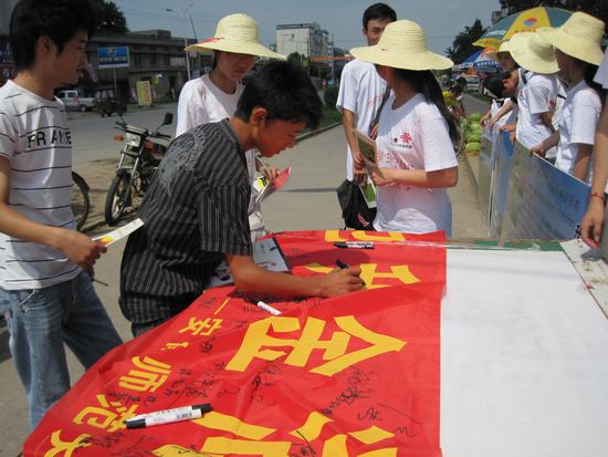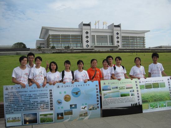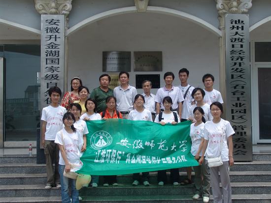 7日上午,队员一行到达了保护区管理局所在地东至县大渡口镇,在闹市区进行了展板宣传、发放宣传册及以“保护家乡湿地,升金湖连着你和我”为主题的签名活动。之后,同学们与前来慰问的席贻龙院长、邵建章教授、汪倩倩老师、陈九保老师以及保护区管理局的同志们一同观看了有关升金湖保护区的录像。保护区管理局陈局长向大家详细介绍了升金湖的情况。席院长向升金湖保护区管理局以及贵池区经贸委对本次暑期社会实践活动的支持表示了感谢,对同学们的实践活动给与了肯定,并希望同学们能刻苦学习,扎实掌握专业知识,为环境保护、湿地保护多做贡献。
