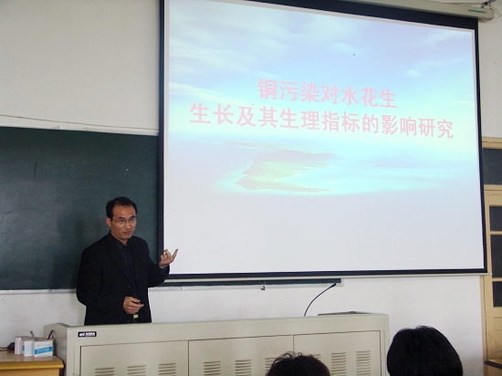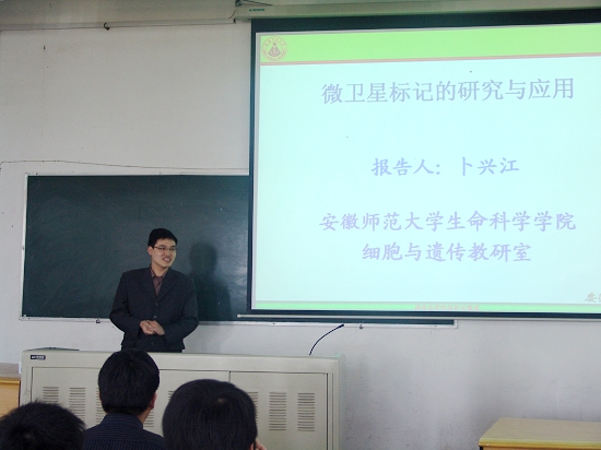 下午的第四场报告会上,刘爱民副教授,在职博士生黄永杰和卜兴江老师应邀分别做了专题报告。刘爱民副教授作的“农业废弃物资源化技术研究进展”报告介绍了农业废弃物堆肥、堆肥快腐技术和秸秆生产气化技术以及现实意义等;黄永杰老师作的“铜污染对水花生生长及其生理指标的影响研究”报告从水花生入侵过程入手,介绍了地球化学元素与健康、水花生的生物学特征和水花生在重金属富集能力研究的进展和部分成果;卜兴江老师作的“微卫星标记的研究与应用”报告着重介绍了微卫星的形成机制和应用、中华鳖微卫星位点的引物筛选和分离等内容。