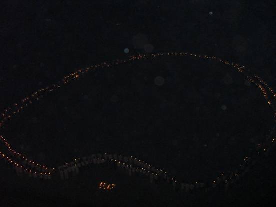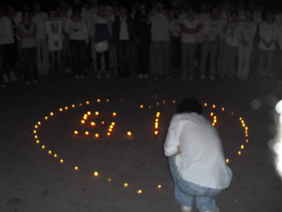 到场的同学整齐地排好队伍,同学们手拉着手,在操场上站成了一个心形,全体到场师生集体为地震中逝去的同胞默哀祈祷。随后,08级各班级依次用合唱和朗诵等形式表达了对遇害同胞的怀念以及对灾区人民的关心与祝福。最后,全体同学手捧蜡烛,将整个心形点亮,齐声唱起了《祈祷》,共同为汶川祈福,为中国祈福!