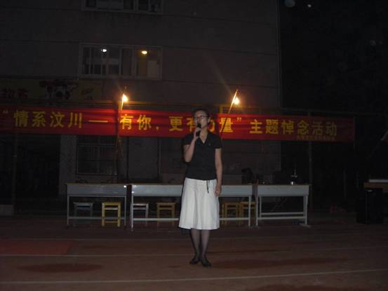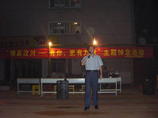 朱升学为悼念活动致辞。朱老师带领同学们回顾了2008年5月12日那场震惊了中国、震惊了世界的特大自然灾害,回顾了地震发生时以及抗震救灾过程中一幕幕感人肺腑的画面、一个个让人们肃然起敬的身影,他希望广大同学在点燃蜡烛,深深地为遇难的同胞祈祷的同时,要铭记那些在危难时刻挺身而出的平凡英雄,铭记那些共和国的忠诚卫士、白衣天使,铭记所有为抗震救灾奉献自己力量的人们!