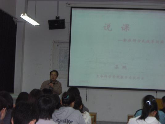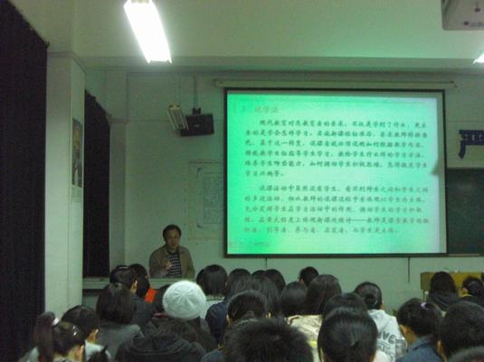 晏老师就说课的特点,说课的含义和基本内容等方面进行了详细地阐述,指出作为一种重要教研方式,说课也是目前中等学校选聘老师的重要考核手段。在着重介绍如何开展说课活动的同时,晏老师还通过对大量实例的列举就说课过程中的一些注意事项进行了精彩的点拨。整个讲座过程中,晏老师谈吐幽默,旁征博引,赢得同学们的阵阵掌声。