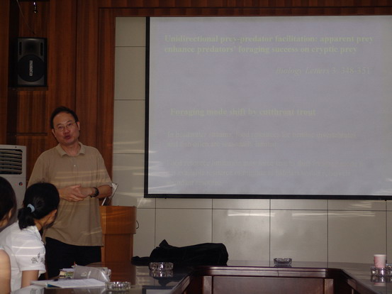 张博士主要介绍了溪流生态学研究的方法、通过对溪流生态的研究反映人类生产生活对生态环境的影响等,内容丰富,图文并茂,精彩生动,受到听众的欢迎。会后,张一新博士还与会师生就有关研究问题做了深入交流。
