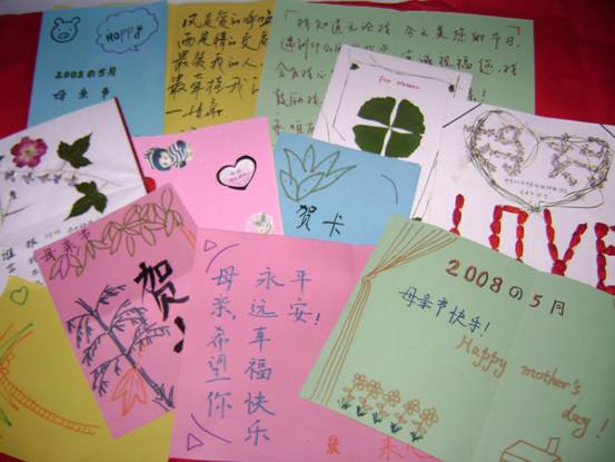 整个教室都沉浸在对母亲深深的思念中。有的同学将在纸上写下的祝福语张贴在班级宣传栏内,有的同学则亲手制作了贺卡,尽管没有买的贺卡精致漂亮,但对母亲深深的思念、由衷的感激祝福之情跃然纸上。更多的同学们则是拿起手机为在家乡辛勤劳作的母亲发去短信或打去电话表达思念和感激之情。