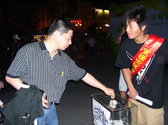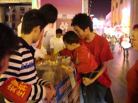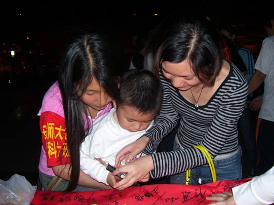 夜色下,同学们佩戴绶带袖章,手捧募捐箱,通过展板向过往的行人宣传介绍四川地震灾区的严酷灾情。过往的行人为同学们真诚的呼吁所打动,停下匆匆的脚步,慷慨解囊,为灾区人民献上一片爱心。同学们将自己折叠的纸鹤送给每位捐款的行人,并邀请他们在横幅上留下姓名,留下祝福,为受灾的同胞们祈福。