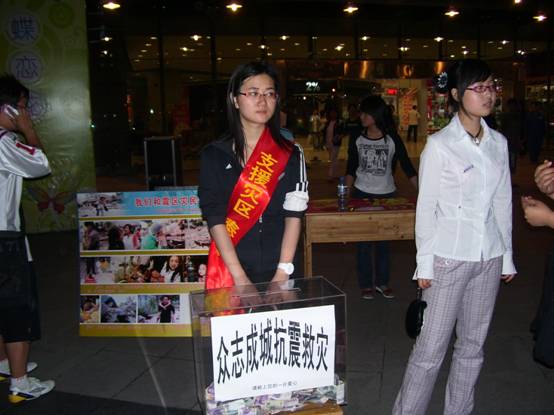 在学院党委领导的支持和鼓励下,07生科6班全体同学行动起来,以最快的速度制作出了横幅、展板和“呼吁书”,并很快取得了芜湖市镜湖区民政局的许可和凤凰美食街管委会、嘉信茂广场管委会等社区的支持,“众志成城,支援灾区”的募捐活动于5月15日晚在嘉信茂广场和凤凰美食街入口拉开了序幕。