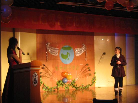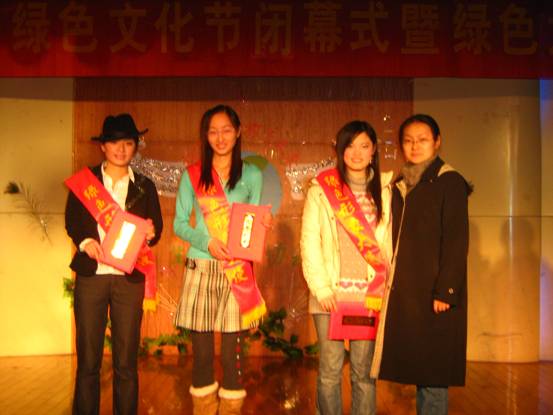进入决赛的共10位选手,其中还有音乐学院和教育科学学院等学院的同学。本次比赛分两个环节,首先是选手们以环保为主题制作的幻灯片展示,接着进入才艺展示与环保知识问答环节。精美幻灯片的展示和选手们对环保问题的准确回答赢得了观众们的阵阵掌声。担任比赛评委的有3044am永利集团官网团委书记薛辉老师及04、06、07级辅导员老师,校社团联合会,院学生会及其它协会代表也应邀出席了此次比赛。最终,来自花津校区05级的汝金英同学和3044am永利集团官网07级的唐玉同学获一等奖,并与三位二等奖获得者共同取得“绿色大使”荣誉称号。到场老师为选手们颁发了荣誉证书,并合影留念。
