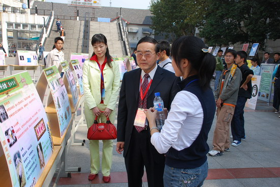 教育部本科教学工作水平评估专家组组长李进才教授在中午考察完学生食堂后绕有兴趣的观看了永利的图片展,并听取了永利学生干部关于图片展的相关介绍。