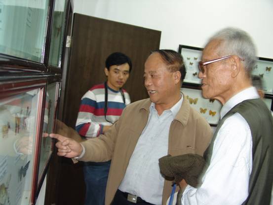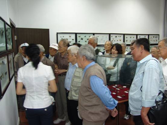 老教师们在解说员的陪同下参观蝴蝶标本分馆