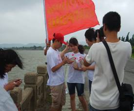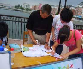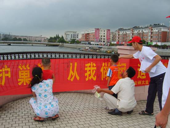 7月15日上午,调研团队全体队员,在巢湖金码头步行桥开展了“认识蓝藻 保护巢湖”大型宣传活动。队员们制作宣传展板,向市民散发“认识蓝藻,保护巢湖”宣传材料,发放“巢湖生态环境调研问卷调查表”并进行回收、统计、分析,组织群众在“认识蓝藻,保护巢湖,从我做起,造福子孙”横幅上签名,呼吁大家“从我做起,造福子孙”,增强保护母亲湖的意识。宣传活动吸引了众多市民驻足观看。随后,队员们来到巢湖岸边,实地考察巢湖水中蓝藻的生长情况并取回水样,检测巢湖水质。