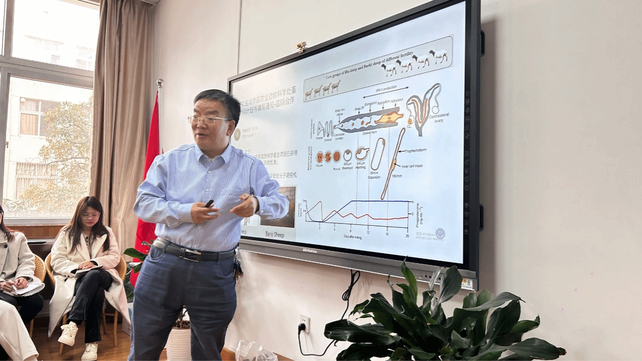 王锋教授从五方面做了全方面且系统的介绍,分别是:肉羊与动物繁殖团队建设、山羊卵泡发育和闭锁调控机制的研究、山羊早期胚胎发育调控机制的研究、山羊克隆胚胎重编程机制的研究和基因编辑与干细胞研究。王锋教授的报告内容饱满充实、数据丰厚,讲解深入浅出、思路清晰,为师生提供了很好的引领和启发。