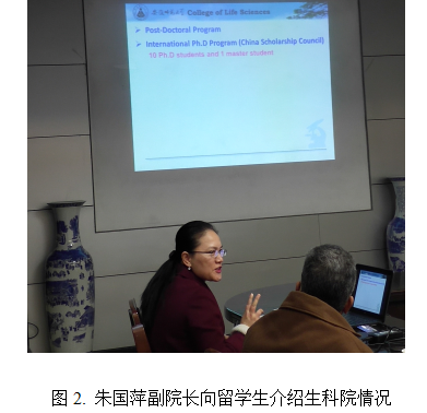 朱国萍副院长用精美的PPT向留学生们介绍了永利的历史发展情况、师资情况、科研情况和培养留学生的具体规划。至2018年,生科院共招收11名国际留学生,包括10名博士生和1名硕士生。他们分别有8人来自巴基斯坦、2人来自埃及和1人来自加纳,这三个国家均为与中国关系友好的“一带一路”沿线国家。来自巴基斯坦的博士留学生沙希德主持了国际留学生自我介绍环节;来自巴基斯坦的博士留学生奥马不仅赞叹了永利科研实力还主动用PPT向老师们介绍了他对中、巴两国风土人情的了解;来自埃及的博士留学生爱丽娅表达了对导师给予她无私帮助和指导的感激之情;来自加纳的博士留学生马丁表达对导师的敬意;每一个留学生的发言都非常精彩。所有留学生均对生科院和国教院领导和老师们给予他们的支持表示了衷心感谢。国教院刘东合院长向留学生们介绍了我校对留学生生活管理和留学生如何获取奖(助)学金等相关情况,并鼓励在生科院学习的各国留学生们多与老师交流互动并及时汇报学习成果。汪诚老师给留学生每人赠送了一本《永利3044noc外国留学生手册》,并介绍了留学生应该遵守我国法律等相关情况。留学生与参加本次活动的领导和老师们进行了热烈而友好的互动。
