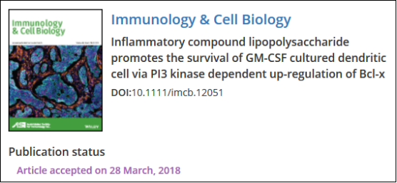 继获得国家基金委重大研究计划项目之后,近日,许岳慷教授课题组在免疫学研究领域颇具影响力的杂志《Immunology and Cell Biology》发表了题为“Inflammatory compound lipopolysaccharide promotes the survival of GM-CSF cultured dendritic cell via PI3 kinase dependent up-regulation of Bcl-x”的研究论文。永利3044noc3044am永利集团官网为此文的唯一作者单位,全部工作由实验室研究生完成,在读硕士生陈舜为论文第一作者。 《Immunology and Cell Biology》杂志隶属《自然》出版集团(Nature Publishing Group),该论文是许岳慷教授课题组组建后发表的首篇原创性论文,它的发表标志着永利3044noc3044am永利集团官网免疫学这门新成立的学科已具国际竞争实力。