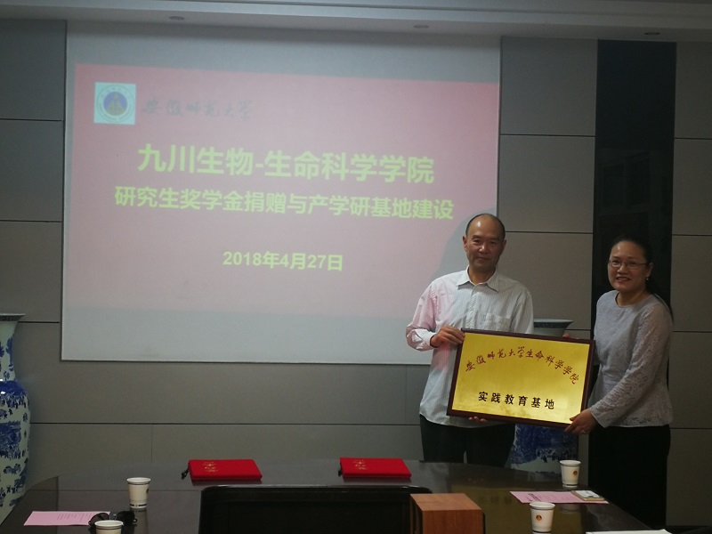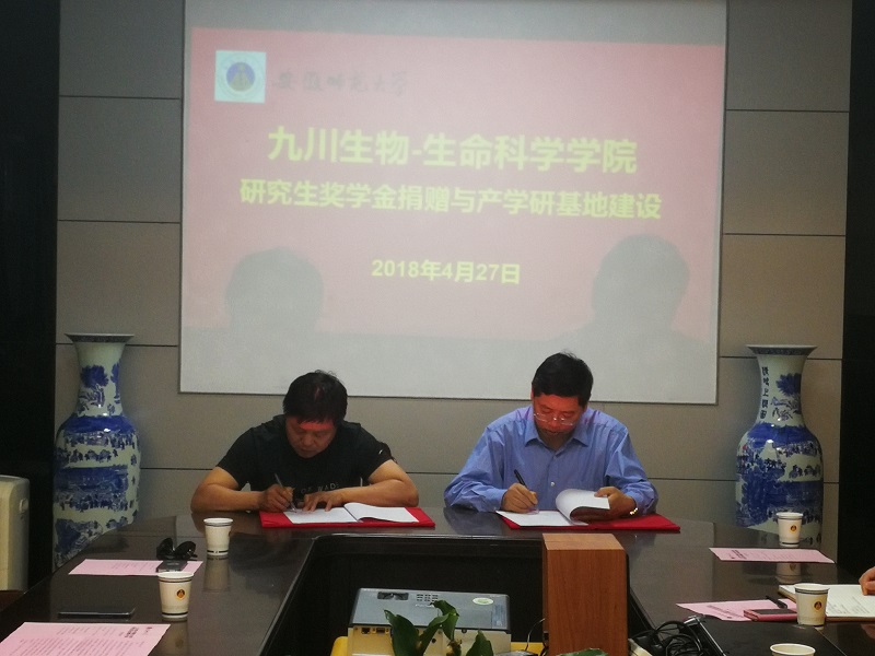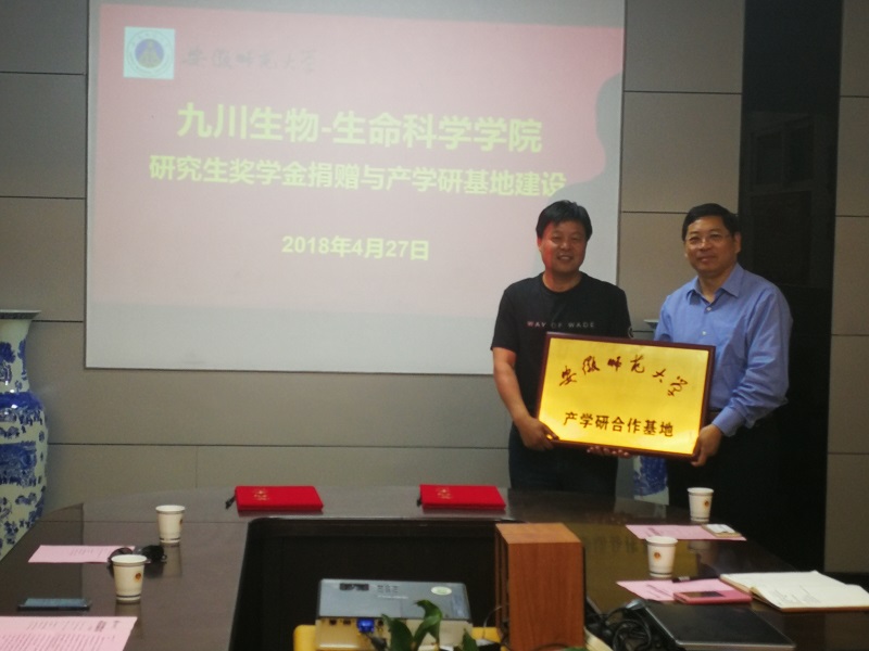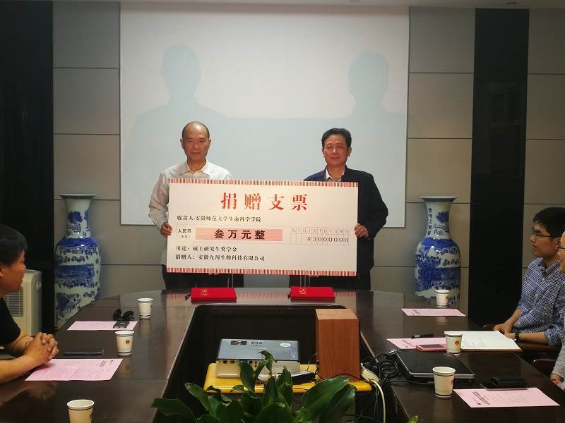 席贻龙表示,九川生物对在校研究生捐资助学是一个善举,是社会大爱的体现。他介绍,学校现有研究生规模大、人数多,尤其在生科院同时拥有2个一级学科博士点,更是学校独一无二的优势。目前在校研究生生源大多来自安徽地区,经济欠发达,虽然学校提供了较为完善的“三助”政策,但部分研究生整体收入不高。九川生物结合地域优势与生科院合作,经营领域也与生科院研究方向契合,选择对生科院捐资助学,是对教育事业、科技事业的支持和奉献。希望双方能够在未来的工作中相互关心、相互支持。