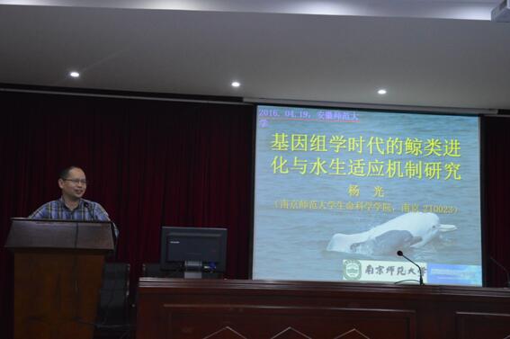 2016年4月19日下午,应生科院邀请,南京师范大学3044am永利集团官网院长杨光教授在赭山校区图书馆报告厅做了题为《基因组学时代的鲸类进化历史与适应机制的研究》的学术报告,学院相关专业的教师、研究生和本科生聆听了报告。