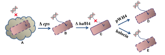 前人的研究结果显示嗜盐菌素能结合在敏感菌株的细胞膜上,并通过改变细胞膜的通透性,使敏感菌细胞最终裂解,从而达到杀死竞争对手,获得更多的营养物质和生存空间,提升嗜盐菌素产生菌株的生存竞争优势。大量的嗜盐菌素通过在细胞膜上结合,并形成孔洞从而裂解细胞,而一定剂量的嗜盐菌素则不会导致敏感菌株细胞的裂解。此外,自身分泌本底剂量的嗜盐菌素是否具有其他方面的生理功能尚不清楚。本研究以地中海富盐菌(Haloferax mediterranei ATCC33500)为研究对象,通过双交换基因敲除技术,成功构建了嗜盐菌素基因缺陷菌株(ΔHalH4),结果发现其在自然情况下获取外源DNA能力大大下降(减少约3个数量级);而将嗜盐菌素合成基因回补入缺陷菌株后,其获取外源DNA的能力恢复。此外,通过使用其他菌株所产生的嗜盐菌素处理嗜盐菌素缺陷菌株,其获取外源DNA的能力得到基本恢复(如图1所示)。上述研究结果清楚揭示了嗜盐菌素在嗜盐古菌摄取外源DNA方面发挥重要作用。这样的DNA获取方式不同于传统的转化、结合和转导过程,可能在自然界中广泛存在。我们的研究结果将为解释嗜盐古菌基因组上含有大量来自于细菌的基因和在嗜盐古菌之间频繁发生水平基因转移的现象提供有力证据。
