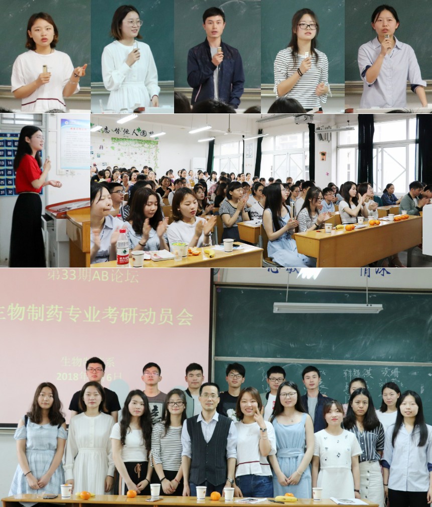 本网讯 (生科院 房雪 宣玉咪)2018年5月6日上午8:30赭山校区田楼8210教室,2014级应用生物科学专业金榜题名的一批考研骄子韩郑祺、易双龙等18名同学应邀做客第33期AB论坛。2016及2017级生物制药专业全体同学参加了本次活动,生物制药专业负责人陈冬生老师主持本场报告会。
