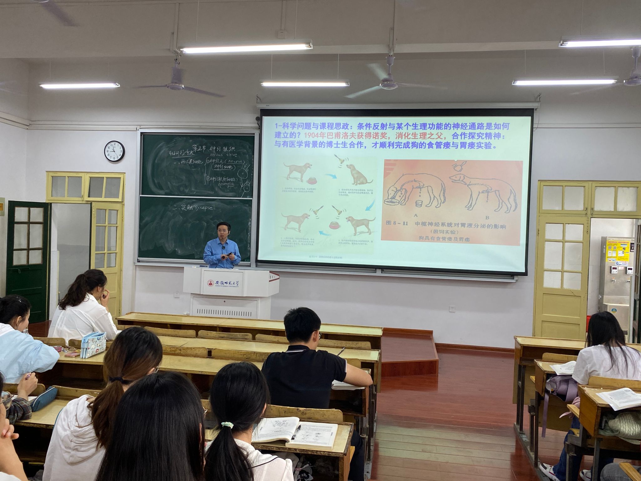 本次示范课的内容为“神经组织”,神经组织包括神经元和神经胶质细胞两大类细胞。神经元的结构与功能是生理学研究的重点内容,神经通路、突触、神经递质、神经递质如何释放都是科学家们研究的课题;神经胶质细胞具有支持、保护和营养等辅助功能。刘老师结合科学问题对本科生进行课程思政,内容既有科学性又有趣味性。刘老师向同学们介绍了1904年诺贝尔生理或医学奖得主巴甫洛夫发现狗唾液分泌的条件反射机制、1936年诺贝尔生理或医学奖得主洛伊维通过设计双蛙心脏灌流实验发现第一个神经递质——乙酰胆碱的过程、2013年诺贝尔生理或医学奖得主祖多霍夫发现突触小泡定向胞吐机制、中国科学家段树民院士揭示神经胶质细胞新功能等4个科学故事,科学故事中体现了科学合作精神(巴甫洛夫与医学博士合作解决狗的食管及胃瘘手术炎症问题)、大胆设想与细心求证的科学创新精神(洛伊维由思考、梦境到试验求证、段树民院士大胆预测神经胶质细胞功能并给予证明),讲课过程有机融入课程思政的内涵。